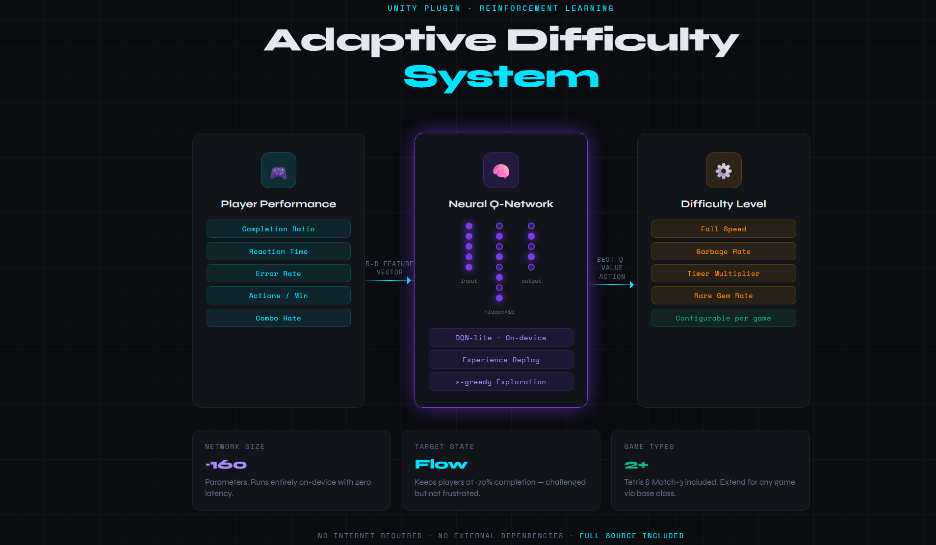 This plugin watches how your players actually perform; their reaction speed, error rate, actions per minute, and combo consistency; and uses a lightweight neural network to continuously tune difficulty in real time. No hand-tuned curves, no static tiers. The system learns what challenge level keeps each player engaged and adjusts automatically, every few levels.